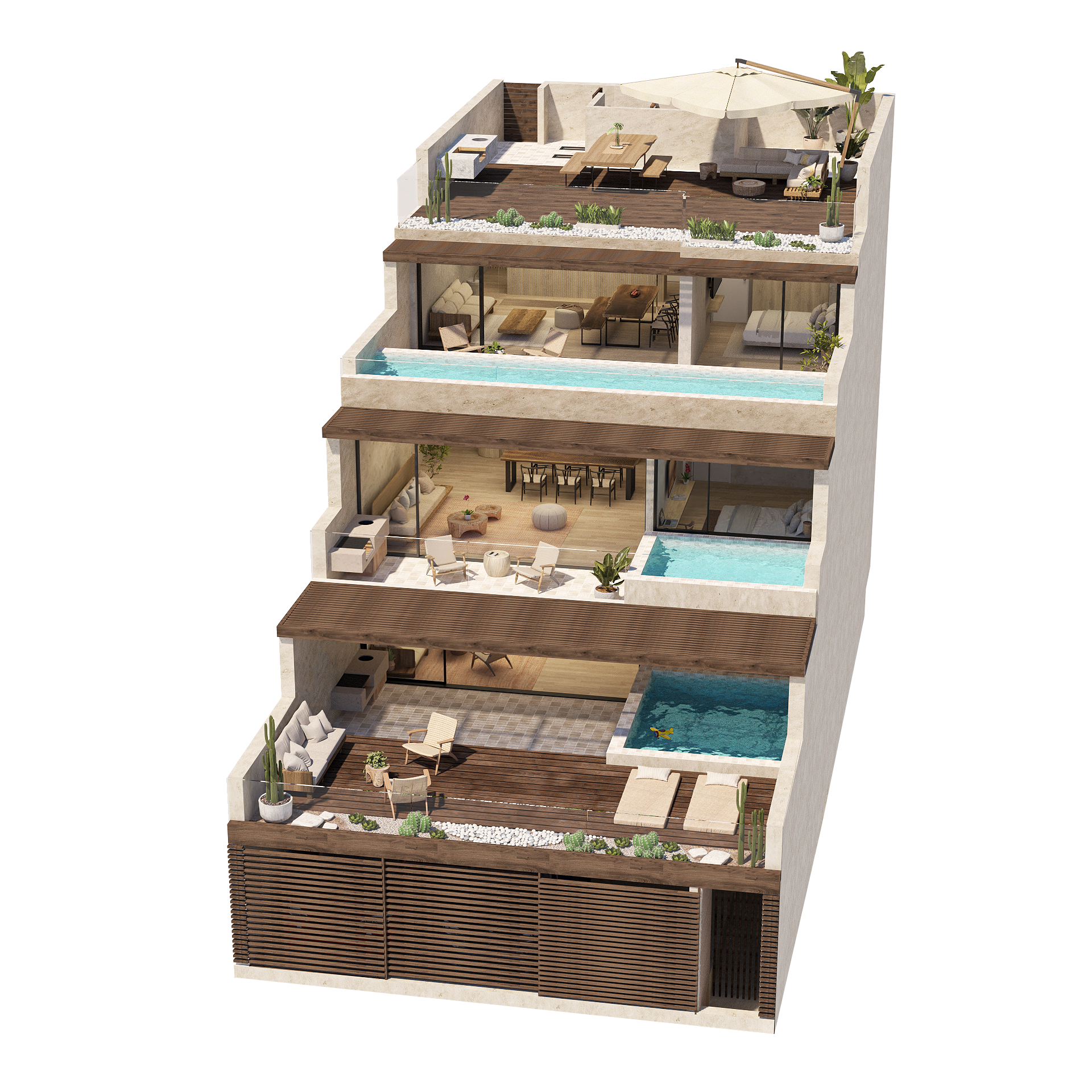 Cada propuesta combina un diseño funcional, moderno y atemporal, con espacios pensados para el confort: amplias terrazas, piscinas y jardines con vistas al océano Pacífico.